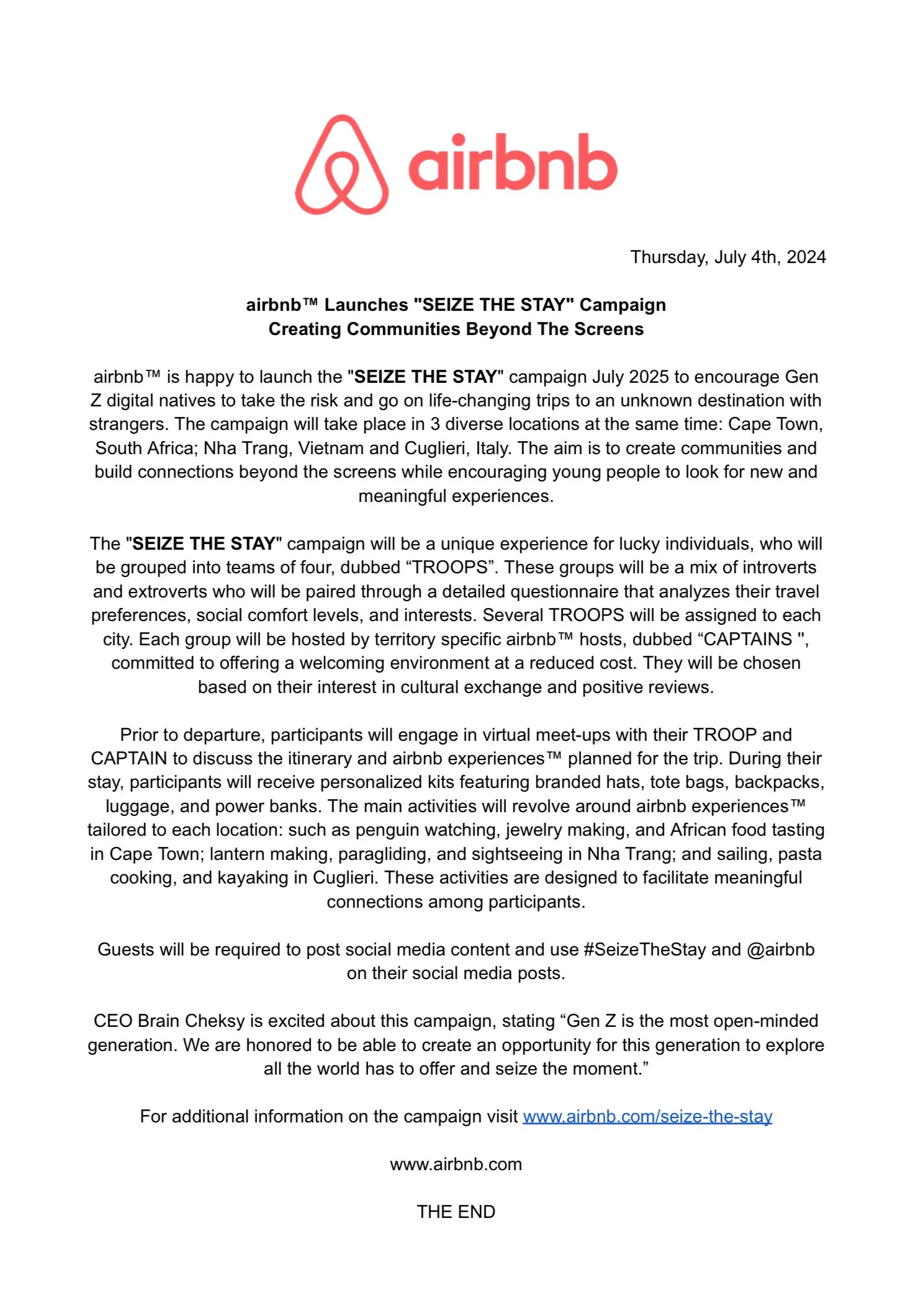 We identified young adults (18-24 years old) as the primary audience, who are digitally engaged but seeking meaningful real-life connections. The campaign goal is to turn digital connections into IRL experiences, aligning with Airbnb's ethos of offering unique stays and authentic community connections. I included personalized kits and diverse travel experiences in locations like Cape Town, Nha Trang, and Cagliari to cater to various travel styles and preferences. Promotion channels were thoughtfully chosen, combining traditional media with digital platforms like TikTok and Instagram to effectively reach the audience.